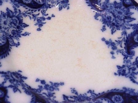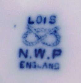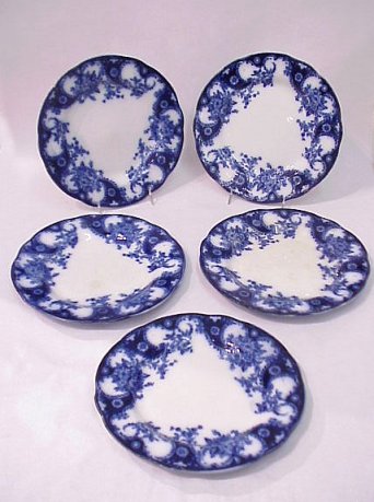 5 ENGLISH FLOW BLUE PLATES IN THE LOIS PATTERN BY NEW WHARF POTTERY: 19th C. flow blue plates, 9'' dia. Please note chips to underside of 1 plate, discoloration to 2.