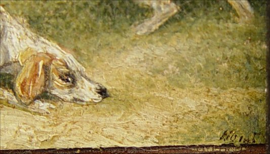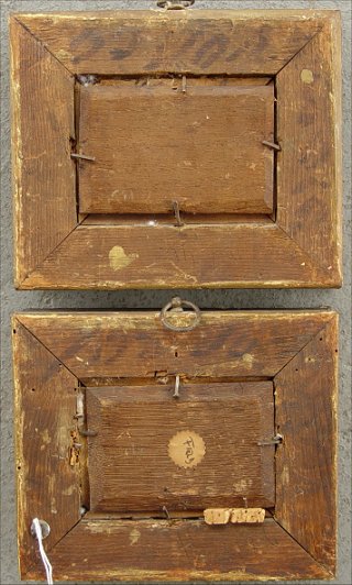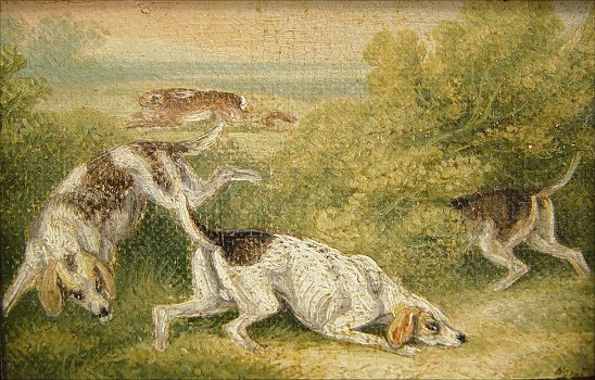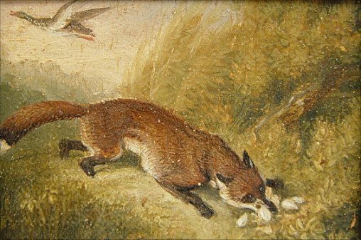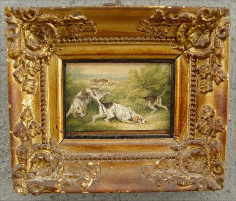 PAIR OF 19th C O/C/B MINIATURES: 1)Depicting hounds pursuing a rabbit, 2)Fox with duck in mouth and one in flight. Each 2 1/2'' x 3 1/4'', encased in period well worn gesso frames, 5 1/2'' x 6 1/2'' overall. One signed illegibly lower right.
