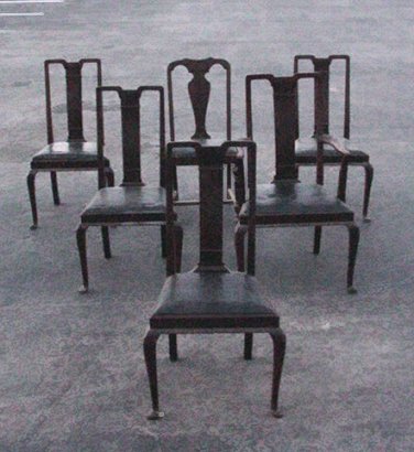 SET OF 5 FINE MAHOGANY SIDE CHAIRS: In need of restoration. Gadroon edging along the seat. Black leather seats. Single center splat.