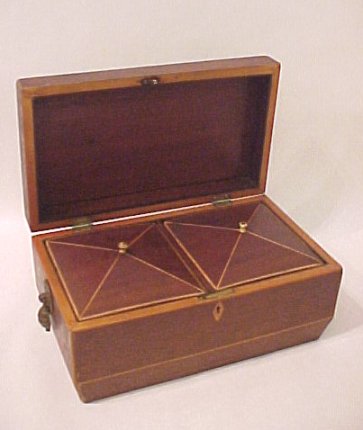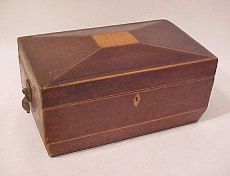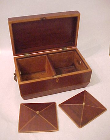 19th C. INLAID TEA CADDY: Sarcophagus shape, double lidded interior. Please note split in back portion of lid. 5 1/4''h, x 7' x 11''.