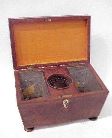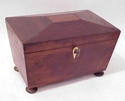 19th C TEA CADDY: Featuring ivory escutcheon, divided interior. Replaced feet, repair to corner. Key included. 6 1/2'' x 11'' x 6 1/4''.