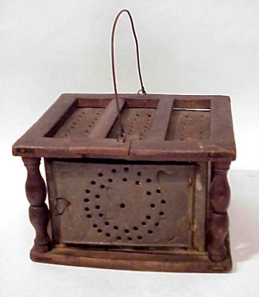MID 19th C PUNCHED TIN FOOT WARMER: In mortised and pegged wooden frame. The tin punched designs feature hearts and 4 petal flower. Wire handle. 5 1/2''h. x 9'' x 7 1/2''.