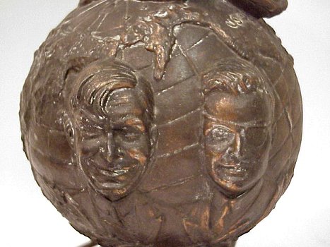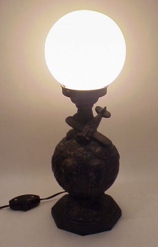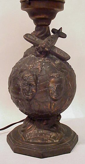WILL ROGERS WILEY POST MEMORIAL LAMP: Patinated pot metal figural lamp, depicting globe with Wiley Post's airplane crashed at top, busts of Will and Wiley below, white glass globe shade, 16''h. overall.