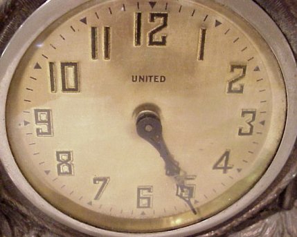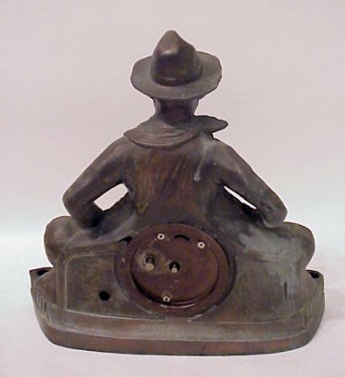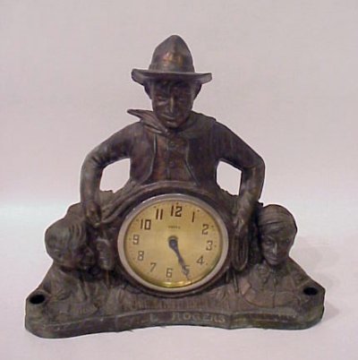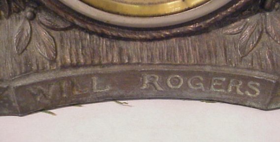 WILL ROGERS FIGURAL CLOCK: Patinated metal figural clock. Larger figure above clock in cowboy hat, figure at his right hand is Will as a radio star, at his left hand is as a movie actor. In large letters across the bottom front is Will Rogers, clock by United, electric, no cord, not currently in working order. Hole in metal at top left of back of clock, approx. 12''h. x 13''w.