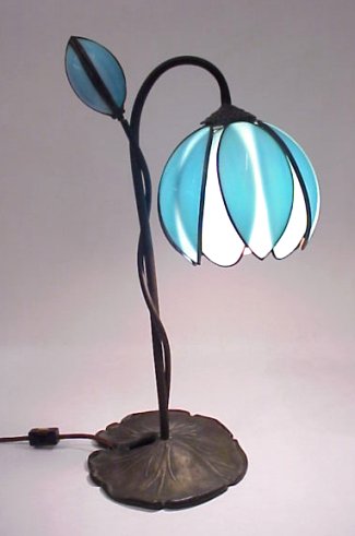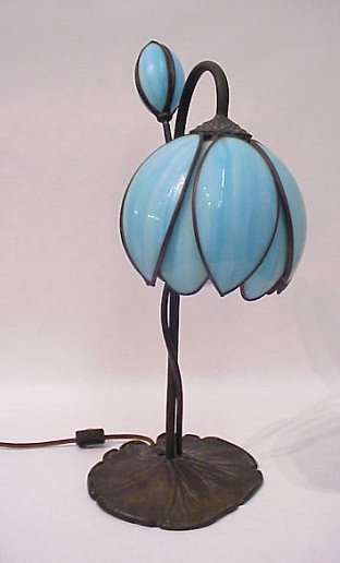 ART NOUVEAU FLORAL GLASS PANELED LAMP, SIGNED