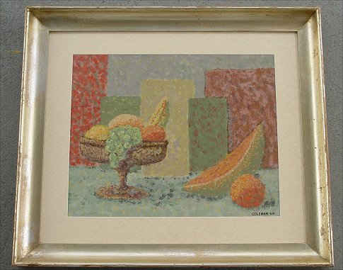 EAMES ERA O/B STILL LIFE OF FRUIT: 15'' x 20'', signed lower right Coleman, dated 60, encased in attractive but moderate/heavily worn gilded frame of the era, overall 22 3/4'' x 26 1/2''.
