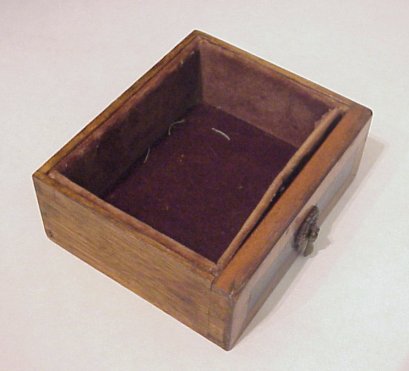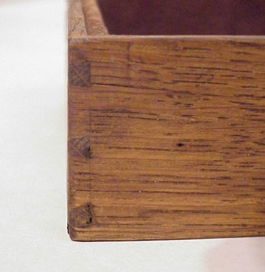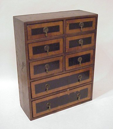 19th C MINIATURE CHEST OF DRAWERS: 9 banded and grain painted velvet lined drawers with drop pulls. Fine dovetail construction. 13 1/2''h, x 10 1/2'' x 4 1/2''.