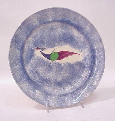 SPATTERWARE PEAFOWL PLATE: Hand painted red, green, and, blue bird on blue. 9 1/8'' dia. No chips or cracks.