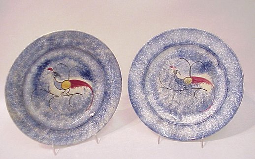 PAIR OF SPATTERWARE PEAFOWL PLATES: Hand painted yellow, blue and red bird on blue. 8 1/4'' dia. No chips or cracks.