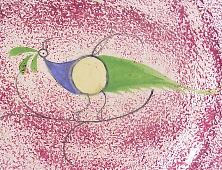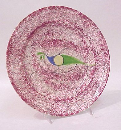 SPATTERWARE PEAFOWL PLATE: Hand painted yellow, green, and, blue bird on red. 8 1/8'' dia. No chips or cracks.