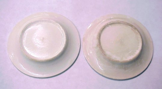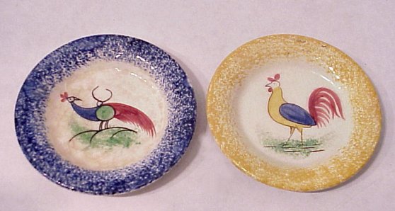 2 SPATTERWARE CUP PLATES: Rooster on yellow and peafowl on blue. 3 3/8'' dia.