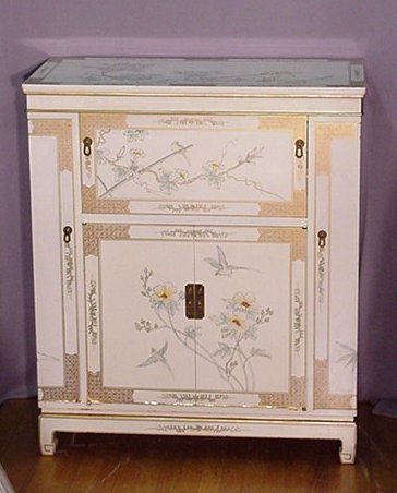 CHINESE HAND PAINTED BAR: Mid century white lacquered bar. Mirrored interior behind drop front center. Lower cabinet storage, sides open to hood barware. 42''h., x 36'' x 18''.