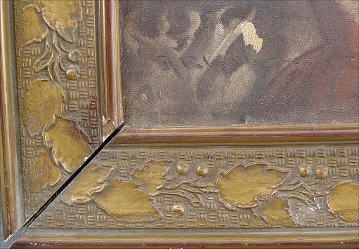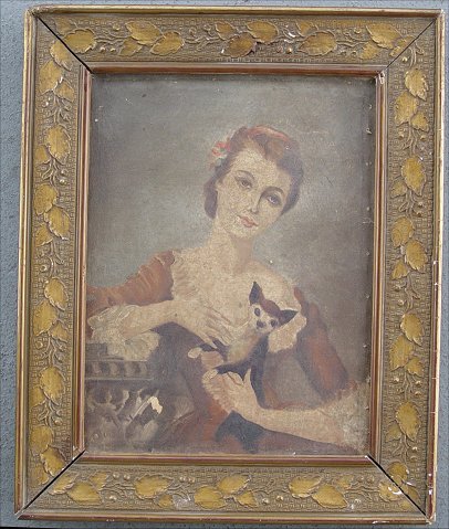 19TH C PORTRAIT OF WOMAN WITH CHIHUAHUA PUPPY: O/C, 16'' x 12'', signed lower left R Foley?, encased in a high quality but damaged embossed heavy gilded gesso frame with leaf and berry motif, overall 21'' x 17 1/4''. Condition - Painting has been re-stretched, possible re-line, portion of paint missing above signature in lower left corner, early nail marks along right column, several sporadic portions of paint loss, needs cleaning. Frame shows separation in the corners with minor areas of gesso loss.