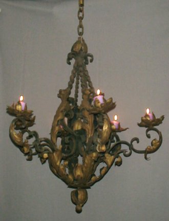 6 LIGHT CANDLE CHANDELIER: Scrolled metal with wonderfully worn gilt finish. Acanthus leaf ceiling plate. 36''h.