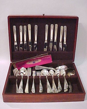 SILVER BELL SILVERPLATED FLATWARE SERVICE: 106 piece service for 10 to include 10 dinner knives, 11 dinner forks, 11 salad forks, 10 tablespoons, 10 cocktail forks, 11 soup spoons, 10 iced teaspoons, 23 teaspoons, 2 casserole spoons, 2 butter knives, 2 meat forks, gravy ladle, and 2 sugar shells. Sold in the wooden storage box.