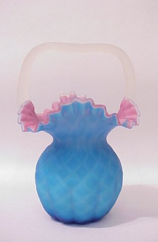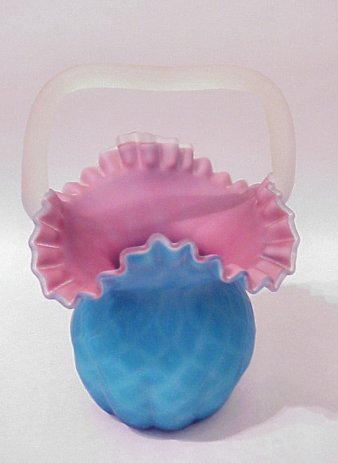 VICTORIAN QUILTED SATIN GLASS ART GLASS BASKET: Blue satin glass basket with interior partially layered in pink. Clear satin bark like handle, ground base. 11 1/2''h., 8'' dia.