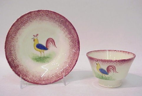 ROOSTER 19TH C SPATTERWARE HANDLELESS CUP AND SAUCER: Hand painted blue, yellow, and red rooster on red. No chips or cracks.
