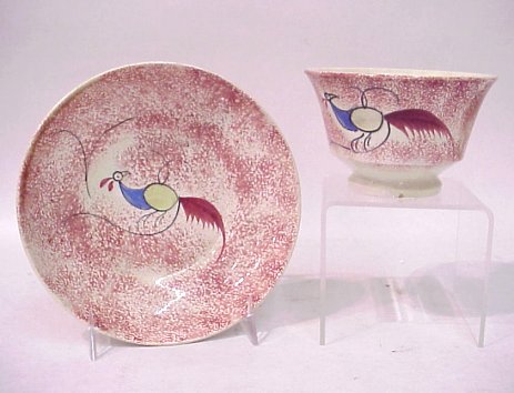 19TH C SPATTERWARE HANDLELESS CUP AND SAUCER: Hand painted blue, very light green, and red peafowl on red. No chips or cracks. Impressed crown mark. Please note chip under cup.