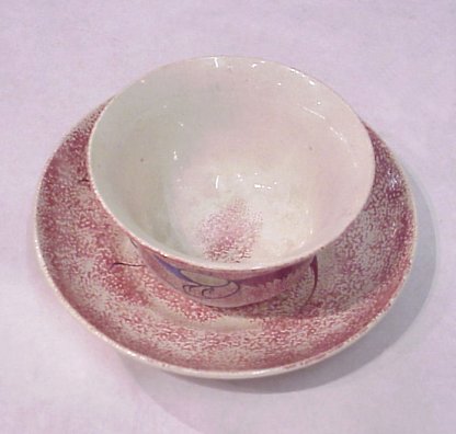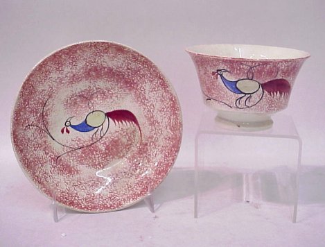 19TH C SPATTERWARE HANDLELESS CUP AND SAUCER: Hand painted blue, very light green, and red peafowl on red. No chips or cracks. Impressed crown mark.