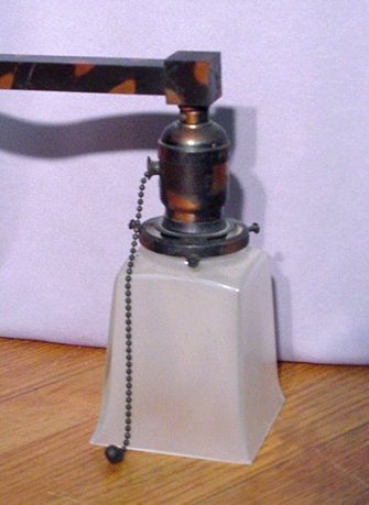 SIGNED MILLER ARTS & CRAFTS CHANDELIER: 2 light hanging light of leopard type metal. Glass shades. 27''h, x 20 1/2'' spread.