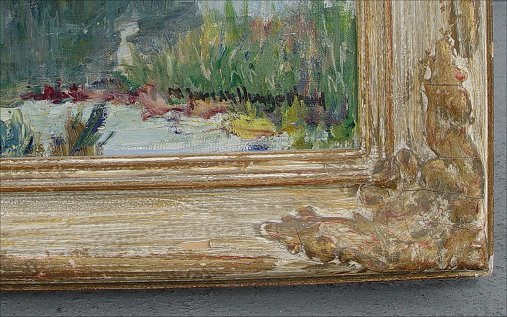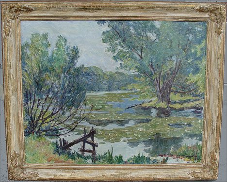 HUNGERFORD, Marian, (American, 20th C): River Landscape, O/C, 24'' x 30'', signed lower right, encased in original gilded molding and paint gilded molding with some wear, overall 29 1/2'' x 35 1/2''.