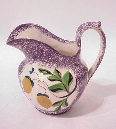 SPATTERWARE CREAM PITCHER: Handpainted Acorn pattern on purple, 4 1/4''h. at handle. No chips or cracks.