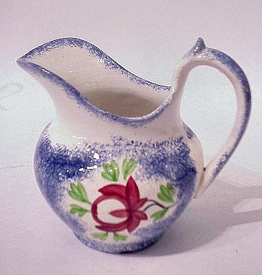 SPATTERWARE CREAM PITCHER: Handpainted rose on blue, 4''h. No chips, crack, or repairs.