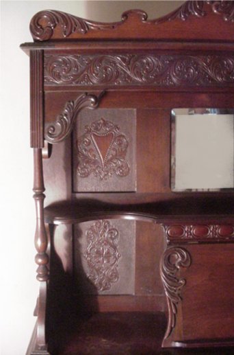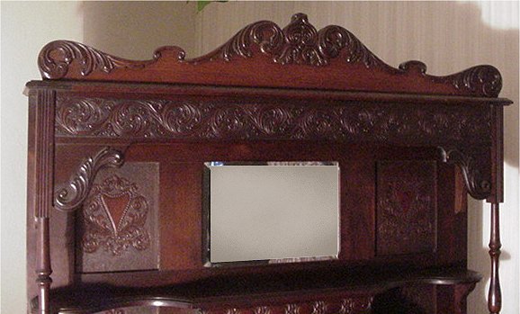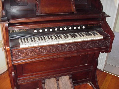 W.W. PUTNAM VICTORIAN HARMONIUM: A true piece of Victoriana! Double foot pump action organ by the W.W. Putnam Co. Staunton PA, beveled mirrored backboard over a hinged music rest with hidden storage, relief and applied carvings throughout. In good working order. 6'h., 45''w., 22''d.