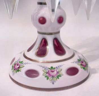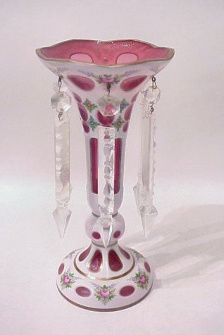 BOHEMIAN CRANBERRY GLASS LUSTER: Hand painted white overlay on cranberry. 10''h. 6 1/4 cut crystal prisms.