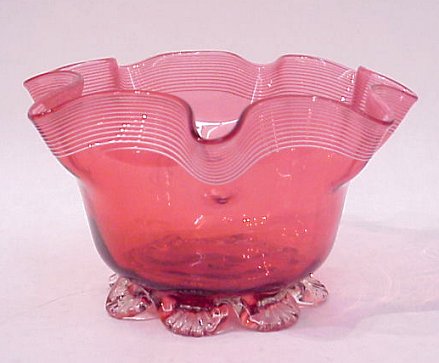 VICTORIAN CRANBERRY ART GLASS BOWL: White threading, ruffle edges, applied clear feet. Burst bubble to the interior. 6'' dia. 3 1/2''h.