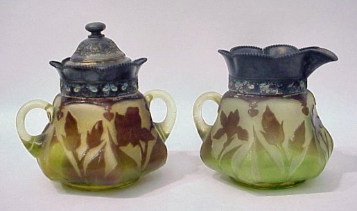 FRENCH CAMEO GLASS CREAM PITCHER AND SUGAR, CA. Late 19th, early 20th C: Unusual reddish brown cut to green in a floral and leaf design. Britannia mount with beading. 4 1/2''h. No makers marks.