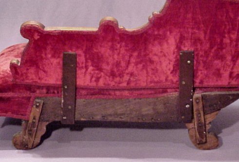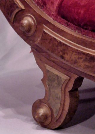 TRUE VICTORIAN CHILD'S WALNUT FAINTING COUCH: Renaissance revival with panels of burled walnut. Red tufted velvet upholstery. 48''l, 24''h.