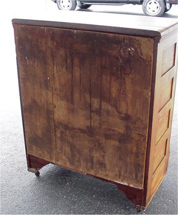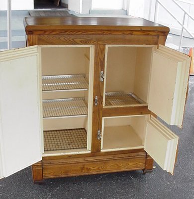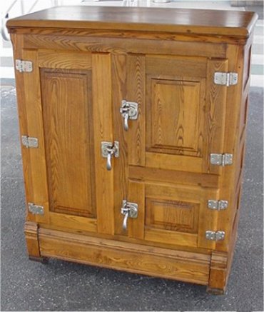 GOLDEN OAK THREE DOOR ICE BOX: Painted interior, refinished exterior, original hardware. Ready for your home or shop. Looks Nice! 46 1/2''h x 38'' x 19''