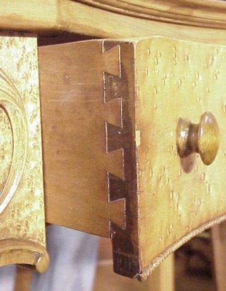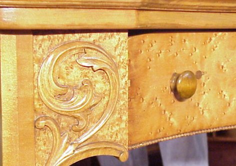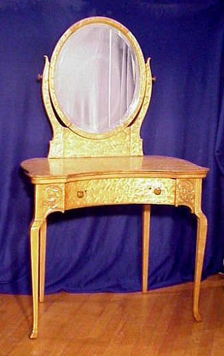 1920'S BIRDS EYE MAPLE DRESSING TABLE: Beveled oval mirror on arm supports. Gracefully shaped top over single drawer that arches inward. Tall slightly cabriole legs. Newly refinished ready for shop or home. 57''h overall.