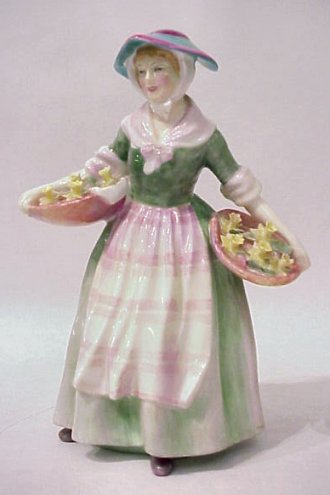 ROYAL DOULTON FIGURE ''DAFFY DOWN DILLY'': HN 1712. Daffodils in baskets. Green and pink with turquoise hat. 7 3/4''h.
