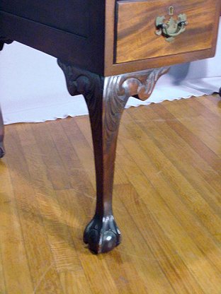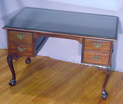 MAHOGANY BALL & CLAW DESK, CA. 1940'S: 4 drawer kneehole desk, cabriole legs ending in ball and claw feet. Fine condition.