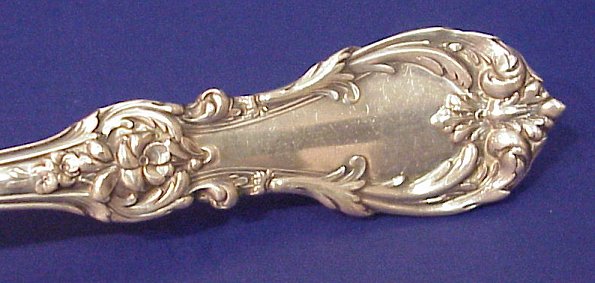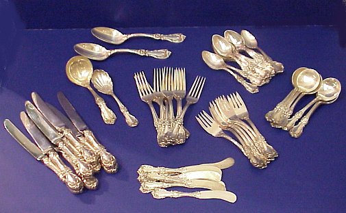 ''BURGUNDY'' STERLING FLATWARE BY REED & BARTON: 60 piece service for 8 in include 8 hollow handle dinner knives, 9''l, 8 dinner forks, 7 1/8''l, 8 flat butter spreaders, 8 salad forks, 8 soup spoons, 16 teaspoons, sugar shell, gravy ladle, and 2 serving spoons.