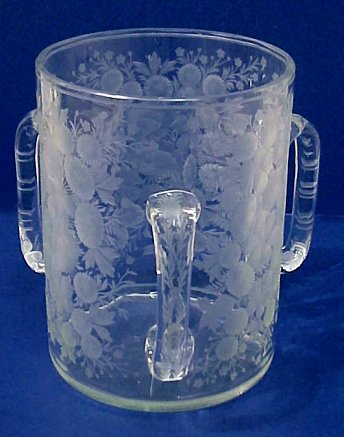 WEBB / HAWKES QUALITY CUT GLASS TRI-HANDLED VASE: All over flower decoration, paneled sides, applied handles also have cut floral design. 6 1/2''h. 5'' dia. Please note flake chip along interior rim.