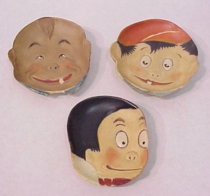 3 NIPPON KATZENJAMMER KIDS: Set of three adorable faced, hand painted kids pin trays. Each with the rising sun mark. 4'' dia. No chips or cracks.