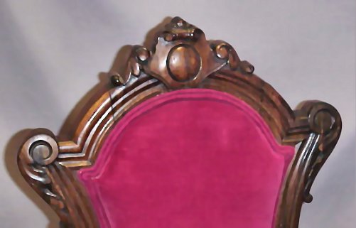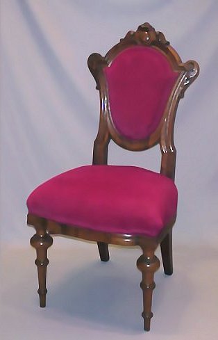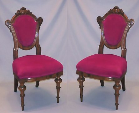 PAIR OF VICTORIAN ROCOCO SIDE CHAIRS: Rosewood and veneers, carved crest, Pompeiian legs. Shield backs and seats are upholstered in rich red velvet. Please note minor veneer loss to back of leg.