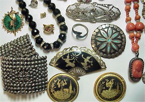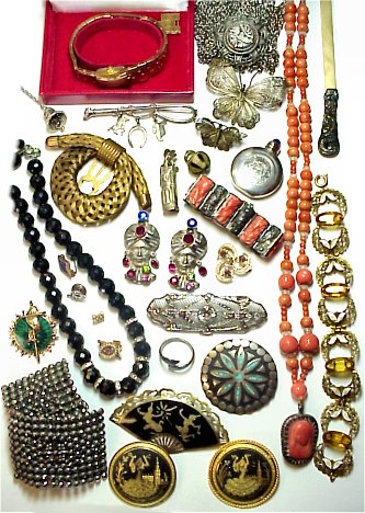 TRAY LOT OF ESTATE COSTUME JEWELRY: To include, lady's Enicar Swiss wrist watch with hidden face, 20 micron gold plated, in original box; coral bead necklace with religious pendant, sterling clasp, approx. 24''l.; black crystal and rhinestone bead necklace; wonderful faux platinum and diamond filigree brooch; Mexican sterling perfume assorted coat clips and marcasite? buckles; Genie head pins with multi colored stone accents; carved coral and silver bracelet from China; Mexican and Siamese sterling pins and ring; fraternal pins; plus more. Sold as a lot.