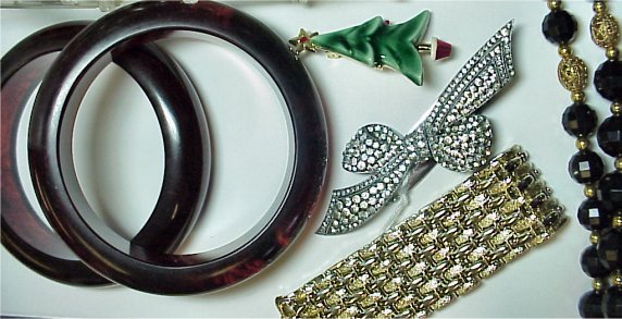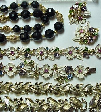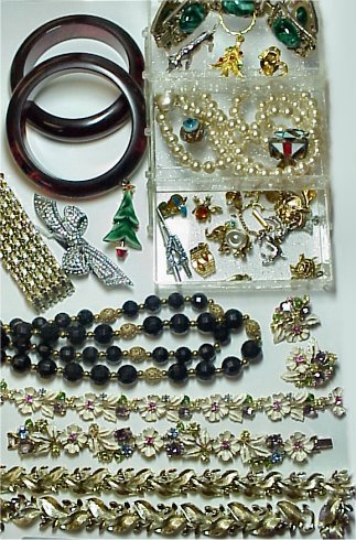 TRAY LOT OF ESTATE COSTUME JEWELRY: To include, 3 pc ensemble foliate motif by Lisner; lovely 3 pc unmarked set, of enamel flowers and faux semiprecious stones; faux tortoise shell bangles and beads; religious copper? disk; assorted charms and pins; faux pearls; Zuni style pin; Coro bracelet; large rhinestone bow motif fur clip; and more. Sold as a lot.