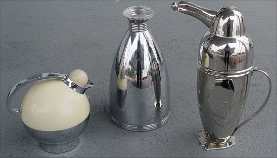 3PC LOT OF DECO METALWARE: To include chrome plated cocktail shaker in the form of a penguin, 11''h., no maker's mark; chrome plated vessel with stopper by Thermos, 6''h., impressed mark to base; and a chrome plated decanter by Manning-Bowman & Co with crystal stopper, 9 3/4''h., impressed mark to base. Sold as a lot.