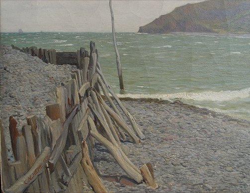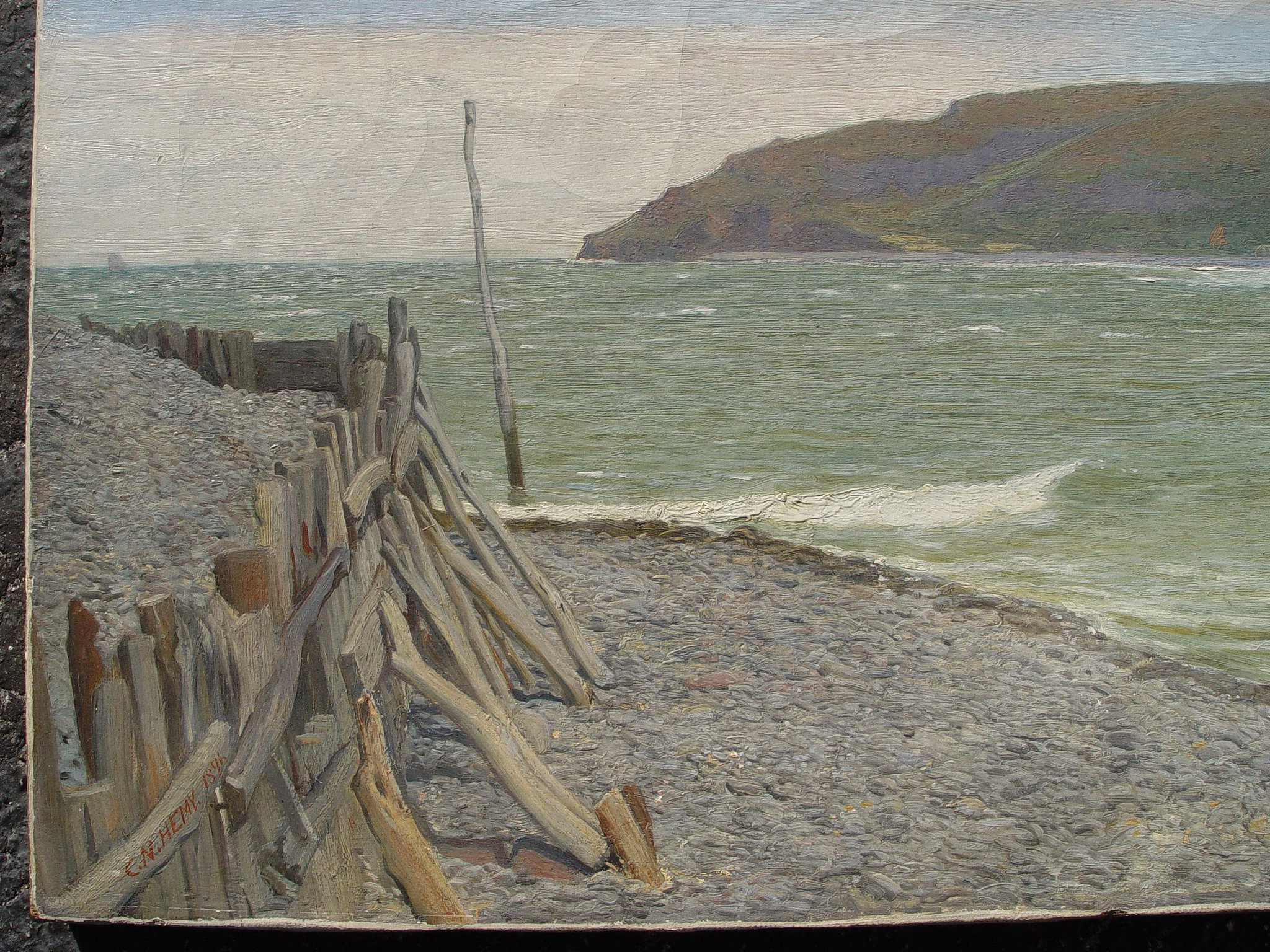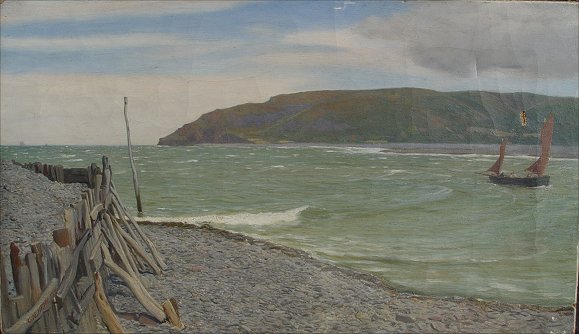 HEMY, Charles Napier, (British, 1841-1917): ''Parlock Bay'', O/C, 11'' x 19'', signed lower left, dated 1891, also signed and titled verso. Condition - Unframed, craquelure throughout, small hole above boat, specks of paint missing in lower right corner. Est. $8000/12000**