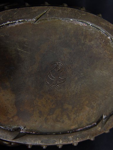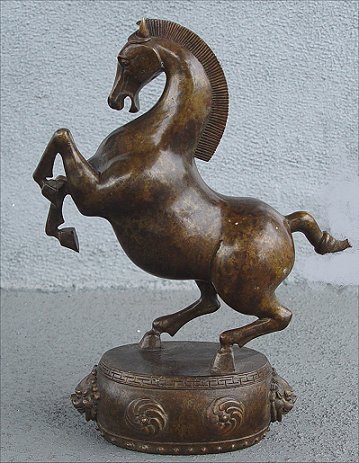 19TH C? SIGNED JAPANESE BRONZE SCULPTURE OF A REARING HORSE: Embossed and incised decor to base with applied masquerons, 9 1/2''h., signature on base.