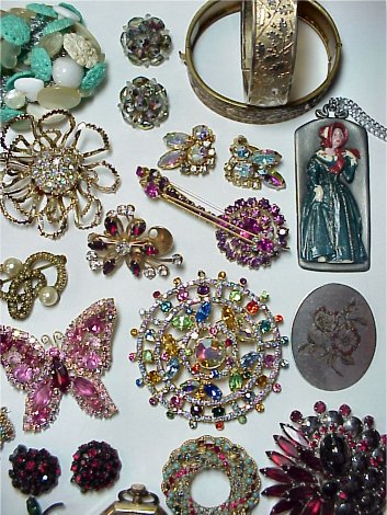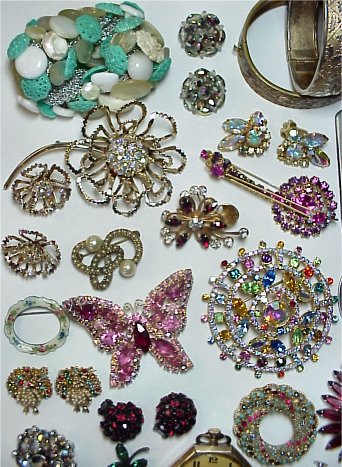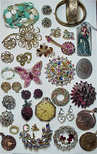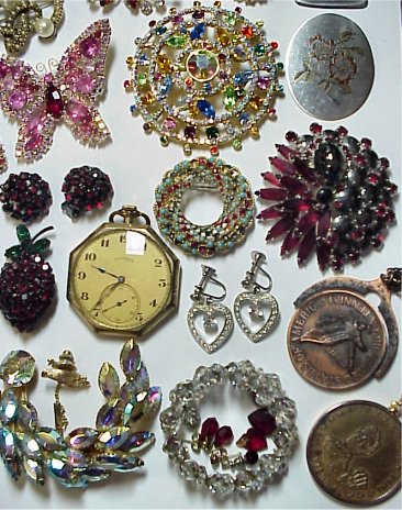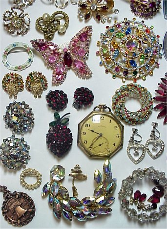 LOT OF ESTATE COSTUME JEWELRY: To include, Weiss heart earrings, Illinois pocket watch, colorful rhinestone pins in assorted shapes and sizes, aurora borealis bead earrings by Claudette and Laguna, historic coin necklaces, German pewter necklace, Reed & Barton pendant/pin, Warner ruby fruit pin and earring set, etc. Sold as a lot.