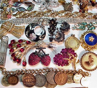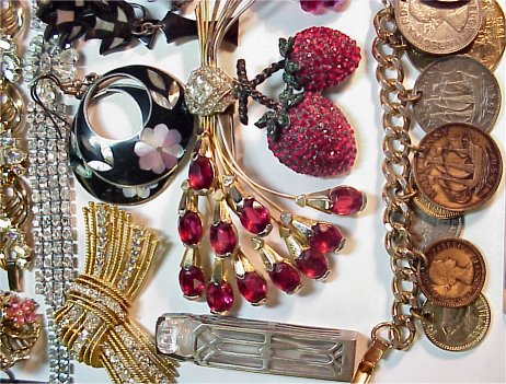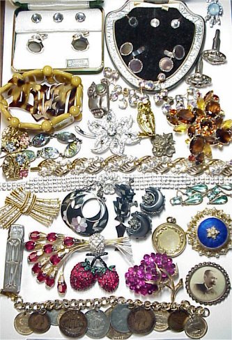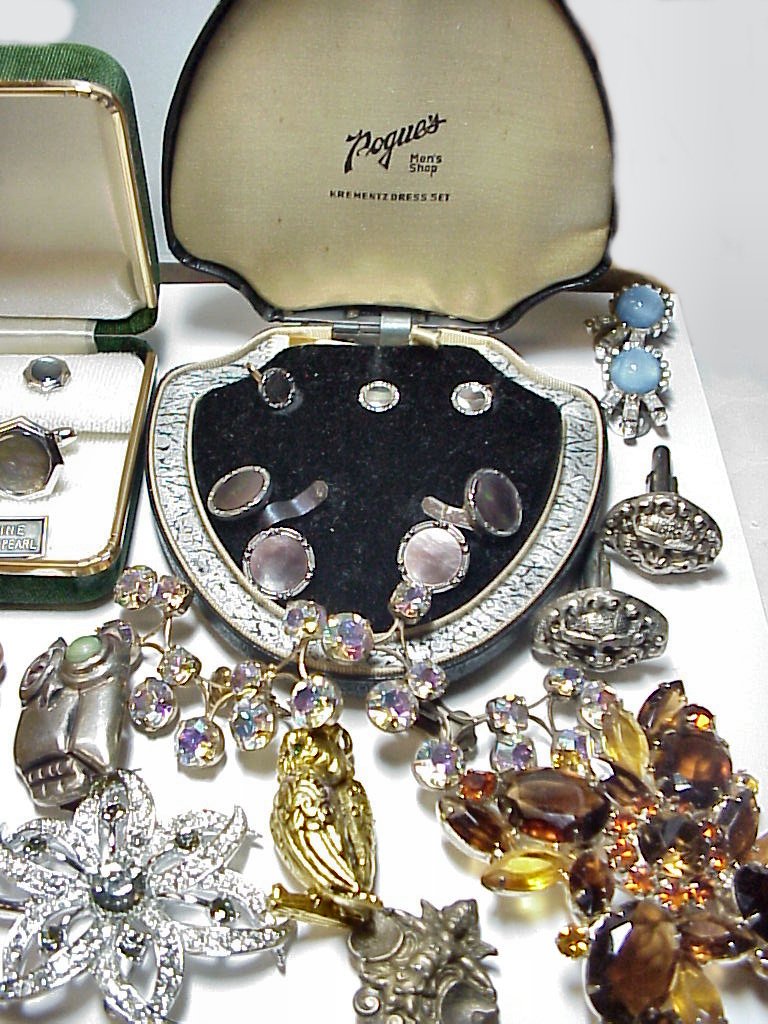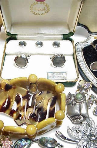 ESTATE ASSORTED COSTUME JEWELRY: To include, English coin bracelet; Trifari pins, bracelet and earrings; Weiss, Sarah Coventry, Fiorenza brooches; Mother of Pearl inlaid earrings and bracelet; small glass perfume in sterling open work frame; sterling silver cufflinks; Mexican sterling owl pin; Max Factor perfume pendant; Victorian sterling figural buckle; Hickok and Krementz gentlemen's dress sets in original presentation boxes; Bakelite? bracelet. Packed tray full sold as a lot.