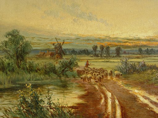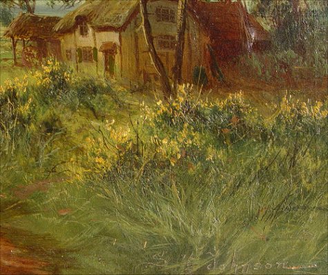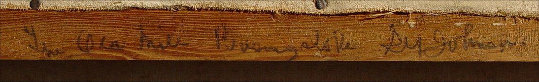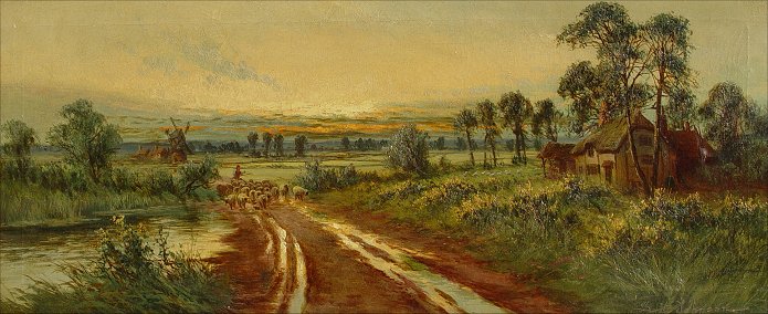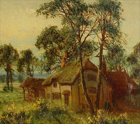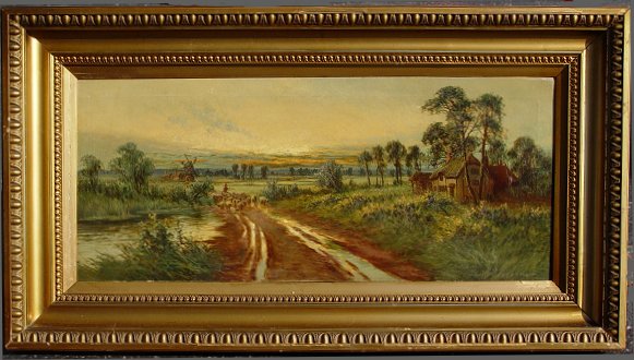 JOHNSON, Sidney Yates, (British, 19th C): ''The Old Mile, Busingstoke'', O/C, 12'' x 28'', signed lower right, signed and titled on stretcher verso, encased in period gilded molding with minor wear. Condition - Painting has stretcher bar wear, small 1/2'' tear in right margin, small abrasion in lower right margin, speck of paint loss in lower left margin quadrant, repair to frame liner left margin. Est. $1400/1800**