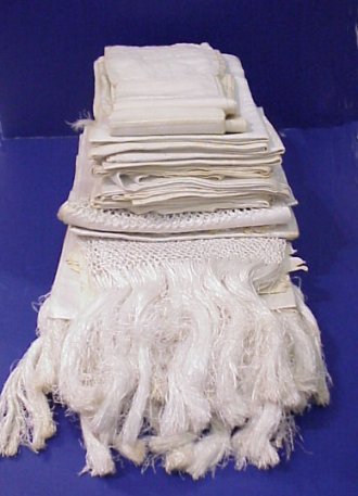 FINE VINTAGE ESTATE LINENS: These linens are still folded, starched and never used since they were given as gifts in the 1930's. 21 pieces of white design on white to include 10 matching linen towels, 28'' x 42''. 6 fabulously fringed table covers, 29'' x 46''. A banquet tablecloth 64'' x 86'' with 8 matching napkins, a 54'' runner, and 3 pillowcases. Discolored with age.
