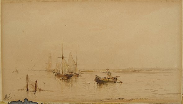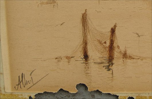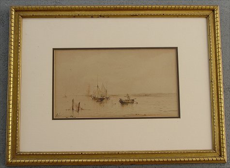 MARKES, Albert, (British, 1865-1901): Harbor Scene with Boats from the Shoreline, 8 1/2'' x 15'', SLL Albert, exceptional detail, encased in period frame, 20'' x 26'', minor wear. Condition-Needs cleaning, small area of insect damage near sig. lower left.